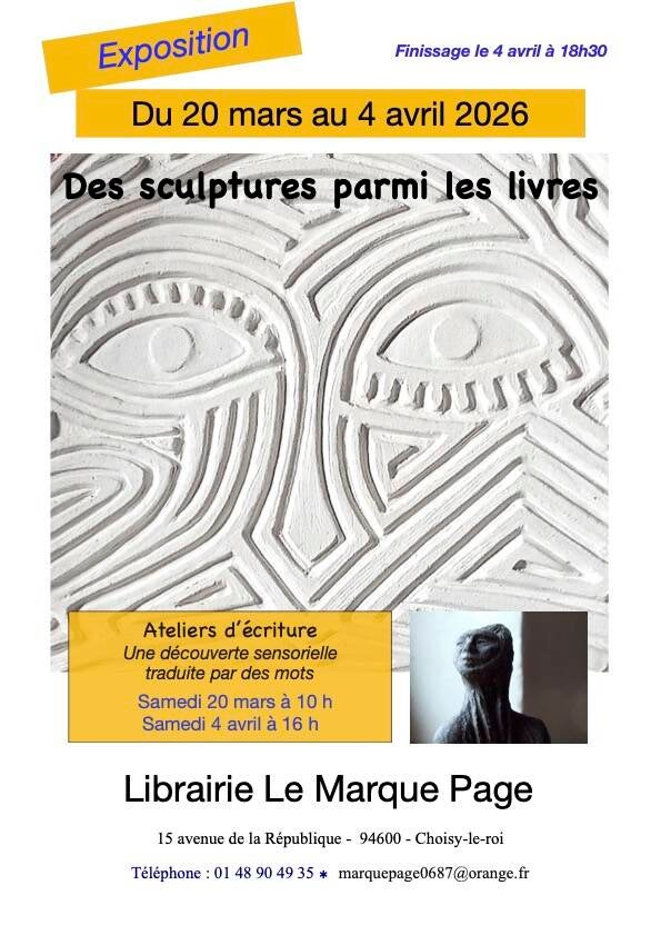 J'ai déjà installé plusieurs fois au Marque Page des photographies, des sculptures, parmi les livres, un moment précieux pour moi qui adore lire et écrire. En discutant avec Cécilia Bianchi la libraire, nous avons évoqué la possibilité d'une nouvelle présence de sculptures, accompagnées d' un atelier d'écriture, dans l'idée d'exprimer "à chaud" des sensations, des impressions, puis d'y revenir en écriture.